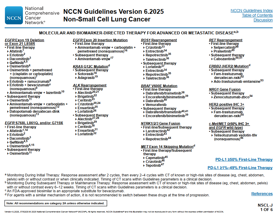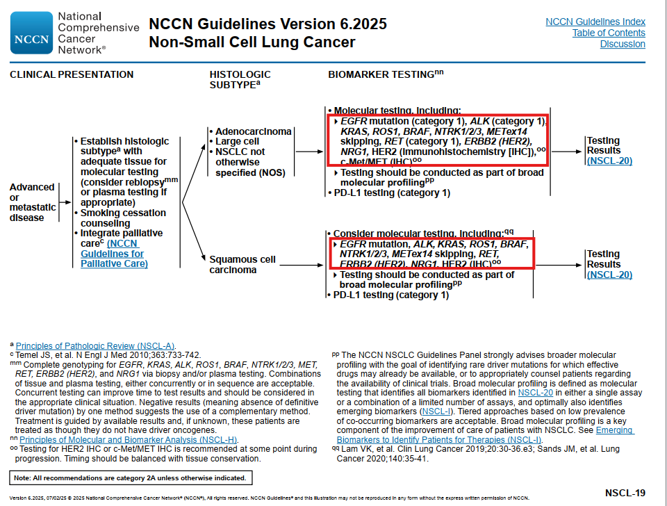 NCCN非小细胞肺癌指南(2025.V4)推荐分子检测包含EGFR、ALK、KRAS、ROS1、BRAF、NTRK1/2/3、MET外显子14跳跃、RET、ERBB2(HER2)、NRG1、HER2(IHC方法)、c-Met/MET(IHC方法)。以上1级推荐的热点基因,我们的肺癌18基因检测套餐都包含。