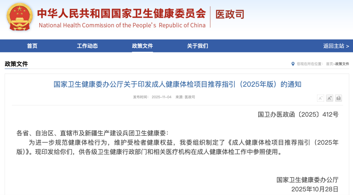 国家卫生健康委办公厅于2025年印发的《成人健康体检项目推荐指引 (2025年版)》中,特别在“认知功能障碍”筛查模块里明确将APOE基因检测列为优先推荐项目。