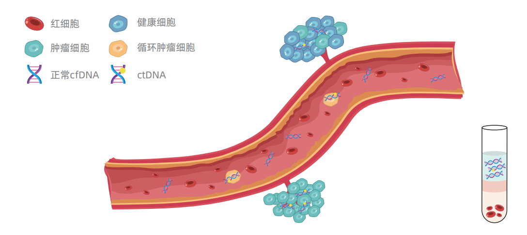 人外周血中含有多种可供检测的肿瘤标记物,包括循环游离DNA(circulating cell-free DNA,cfDNA),有研究发现癌症患者的cfDNA中含有肿瘤细胞凋亡、坏死或分泌产生的DNA片段,这些DNA片段含有基因融合、重排、点突变、甲基化修饰等与肿瘤发生发展相关的基因改变。