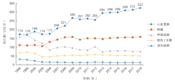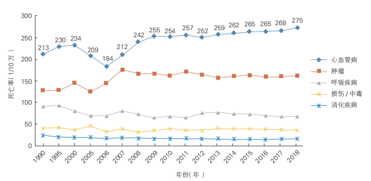 1990~2018 年中国农村居民和城市居民主要疾病死亡率变化