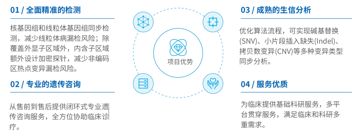 | 增强全外显子组检测(WES) | 超过2 万个基因外显子及其侧翼区域+线粒体基因组+CNV分析 | 血液 | NGS | 20个工作日 |