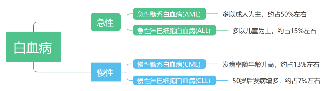 白血病是一种由骨髓中白细胞的恶性增生所导致的疾病。这些细胞会进入血液,也可能浸润其他器官。在急性白血病中,早期淋巴细胞和髓细胞的前体(称为幼稚细胞)增生,但不成熟。临床进展非常快速,不及时治疗会迅速致命。慢性白血病病程较为缓慢,外周血和(或)骨髓出现幼稚细胞增多但分化相对较好,白血病细胞有一定的分化成熟能力,骨髓及外周血以异常的较成熟细胞为主。